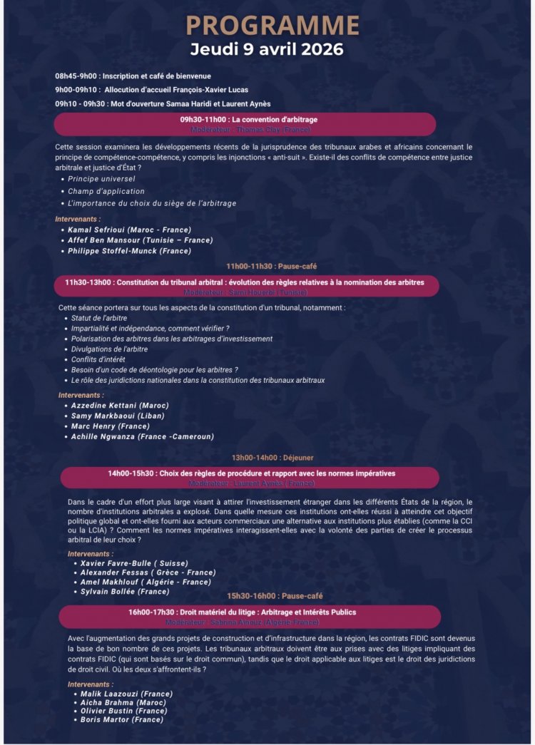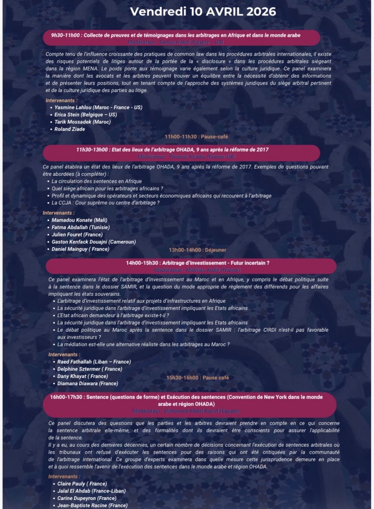 La journée d’aujourd’hui prolonge ce mouvement en ouvrant des chantiers tout aussi décisifs. Le premier panel est consacré à la collecte des preuves et des témoignages dans les arbitrages en Afrique et dans le monde arabe, sous la modération de Samaa Haridi, avec Yasmine Lahlou, Erica Stein, Tarik Mossadek et Roland Ziade. Il sera suivi d’un état des lieux de l’arbitrage OHADA, neuf ans après la réforme de 2017, sous la conduite de Thomas Kendra, avec Mamadou Konate, Fatma Abdallah, Julien Fouret, Gaston Kenfack Douajni et Daniel Mainguy. L’après-midi abordera l’avenir incertain de l’arbitrage d’investissement, autour de Mathias Audit, Raed Fathallah, Delphine Sztermer, Dany Khayat et Diamana Diawara, avant qu’un dernier panel, modéré par Mohamed Abdel Raouf, ne s’attache aux questions de forme de la sentence arbitrale et à l’exécution des sentences dans le monde arabe et dans l’espace OHADA, avec Claire Pauly, Jalal El Ahdab, Carine Dupeyron et Jean-Baptiste Racine. Là encore, la densité des noms et la cohérence des problématiques confirment le niveau exceptionnel de cette première édition.