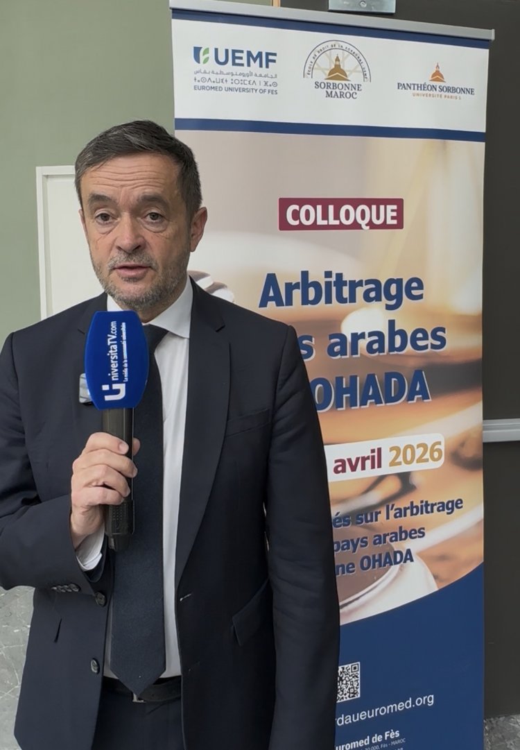 À l’origine de cette initiative, François-Xavier Lucas, directeur de la filière délocalisée de l’École de droit de la Sorbonne à l’Université Euromed, a rappelé au micro d’Universitatv le sens profond de ce colloque. C’est dans le cadre de cette coopération académique qu’a été conçue cette rencontre dédiée au droit de l’arbitrage dans les pays arabes et dans l’espace OHADA. Pour lui, l’enjeu dépasse de loin la seule discussion doctrinale. La question est, dit-il en substance, d’une importance considérable pour le continent africain, et plus précisément pour le Maroc, appelé à offrir aux investisseurs un cadre juridiquement fiable de règlement des différends. En invoquant les orientations royales relatives au pacte national pour l’investissement, il a replacé l’arbitrage dans sa fonction la plus stratégique : celle d’une justice privée choisie par les parties pour sa compétence et son indépendance, indispensable au déploiement des grands projets et au développement économique. L’universitaire a aussi insisté sur la double portée de la manifestation, scientifique d’abord, puisqu’elle permet aux avocats et spécialistes de confronter des analyses très techniques, pédagogique ensuite, car elle offre aux étudiants la possibilité rare de côtoyer pendant deux jours de grands noms de la discipline, dans un échange intergénérationnel fécond, susceptible d’inspirer des trajectoires futures.