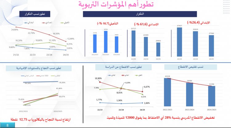 Le soutien pédagogique apparaît comme un autre chantier structurant. Un programme régional de soutien a été lancé en parallèle à la planification des cours et des examens. Plus de 483 827 élèves en ont bénéficié, notamment dans le cadre de séances de renforcement des apprentissages de base. Plus de 1 030 écoles primaires ont été impliquées dans des activités de lecture, de calcul et d’expression motrice, tandis que 633 collèges ont développé des modules sportifs et culturels supplémentaires. Les résultats se lisent dans l’évolution des principaux indicateurs. Le taux de réussite au baccalauréat a progressé de 72,45 % à 80,07 % entre 2022-2023 et 2024-2025, soit une hausse de 12,75 points. Au troisième niveau du collège, le taux de réussite a atteint 81,86 %, contre 69,11 % deux ans plus tôt, et en sixième année du primaire, il s’établit à 95 % au lieu de 94,16 %. La baisse de la répétition est également significative. Dans le primaire, le nombre de redoublants est passé de 37 457 à 27 566 en deux ans, ce qui correspond à une diminution de 26,4 %. Au collège, les redoublants sont passés de 55 727 à 29 903, soit une baisse de 61,6 %. Dans le secondaire qualifiant, la réduction atteint 10,7 %. Les taux d’abandon suivent la même tendance. Au collège, ils ont diminué de 10,90 % à 6,67 % en trois ans, et au lycée de 7,70 % à 5,51 %. En valeur absolue, le nombre d’élèves sortant du système éducatif a reculé de 43 528 à 31 396 entre 2022-2023 et 2024-2025, ce qui signifie que plus de 12 000 élèves supplémentaires ont pu être maintenus dans le système scolaire. Le soutien ne se limite pas aux apprentissages académiques. Quelque 36 012 élèves ont pris part à un programme de promotion de la santé psychique, signe qu’une attention nouvelle est portée au bien-être à l’école.