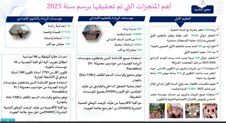 Cette montée en puissance des établissements pionniers s’inscrit dans un mouvement plus large d’élargissement de l’offre scolaire. En 2025, quarante-sept nouvelles institutions ont été retenues, dont vingt-sept en milieu rural, et huit internats supplémentaires ont été créés. Trois cent soixante-trois salles de classe ont été aménagées dans le cadre de l’extension des établissements. Le nombre de classes à niveaux multiples a été réduit à 3 244, ce qui représente 18,25 % de l’ensemble des classes, et près de 85 % de ces classes ne regroupent plus que deux niveaux au maximum. L’effort est tout aussi visible dans le préscolaire. Par rapport à l’année précédente, 6 500 enfants supplémentaires ont été accueillis. Au total, environ 70 300 filles et garçons fréquentent désormais le préscolaire public. Plus de 500 nouvelles classes ont été ouvertes, 348 salles dédiées ont été construites et près de 500 éducatrices et éducateurs ont été recrutés par des associations partenaires pour l’année scolaire 2025-2026. La formation de ce personnel a été renforcée : 618 éducatrices et éducateurs ont suivi un parcours de formation dont la durée est passée de 400 à 950 heures. À l’entrée en première année du primaire, 70 000 enfants ont fait l’objet d’une évaluation systématique de leurs acquis, ce qui illustre la volonté de suivre les parcours dès les premiers pas dans la scolarité obligatoire.