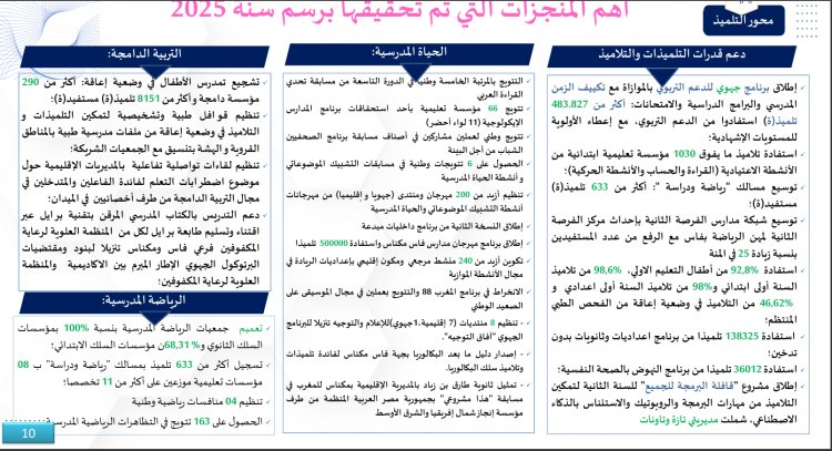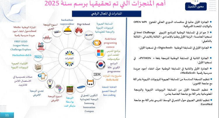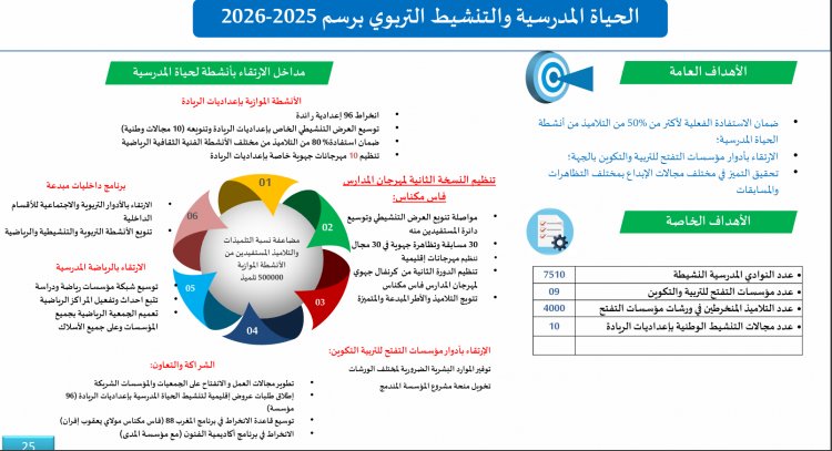 La revitalisation de la vie scolaire complète ce tableau. Dans le domaine culturel et citoyen, plus de 200 festivals et rencontres ont été organisés au niveau provincial et régional. Environ 500 000 élèves ont participé à des activités théâtrales, musicales, scientifiques ou de lecture publique. Deux cent quarante manifestations ont été consacrées à la valorisation des initiatives des élèves et à l’ouverture des établissements sur leur environnement. Les clubs numériques, de programmation et de robotique ont permis à plusieurs équipes d’élèves d’obtenir des distinctions nationales et internationales. Le sport scolaire confirme lui aussi cette dynamique. Les associations sportives sont désormais présentes dans 100 % des établissements du secondaire et dans 68,31 % des écoles primaires. Six cent trente-trois établissements participent à des compétitions sous le label “Sport et études”, couvrant onze disciplines. Quatre championnats nationaux ont été organisés et les équipes de la région ont obtenu 163 podiums, ce qui renforce le sentiment d’appartenance et la motivation des élèves. La dimension inclusive n’est pas absente de ce mouvement. Deux cent quatre-vingt-dix établissements accueillent des classes adaptées pour enfants en situation de handicap, bénéficiant à plus de 8 151 élèves, et des campagnes de sensibilisation ont été menées en faveur d’une culture scolaire plus inclusive.