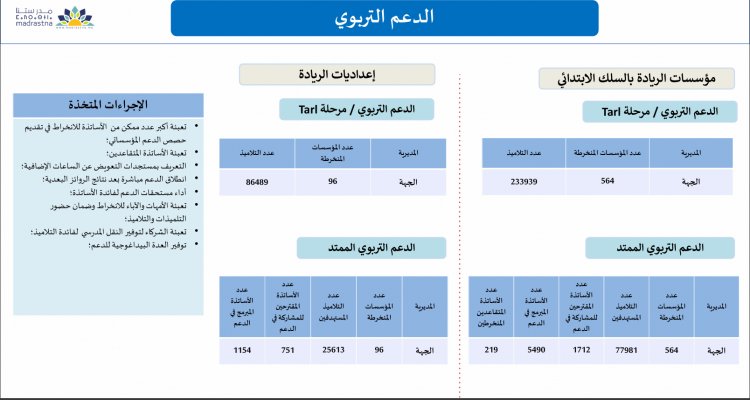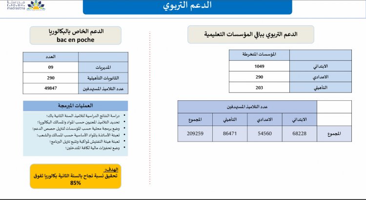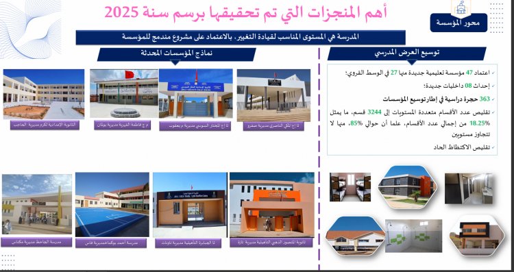 L’amélioration de l’offre concerne aussi les infrastructures et les ressources pédagogiques. Trois cent trente-huit établissements ont bénéficié de travaux de réhabilitation. Environ 1 569 coins lecture ont été installés dans les classes du primaire et 3 357 ouvrages ont rejoint les bibliothèques de proximité sur la base d’une liste nationale de référence. Sur le plan numérique, 4 305 salles ont été équipées en dispositifs multimédias, dont 2 914 dans le primaire et 1 305 dans le secondaire, et 5 365 tableaux numériques ont été déployés. Soixante-et-un millions de dirhams ont été mobilisés pour financer les projets des établissements intégrés dans le programme d’institution intégrée, ce qui témoigne d’un investissement conséquent dans la modernisation de l’environnement scolaire.