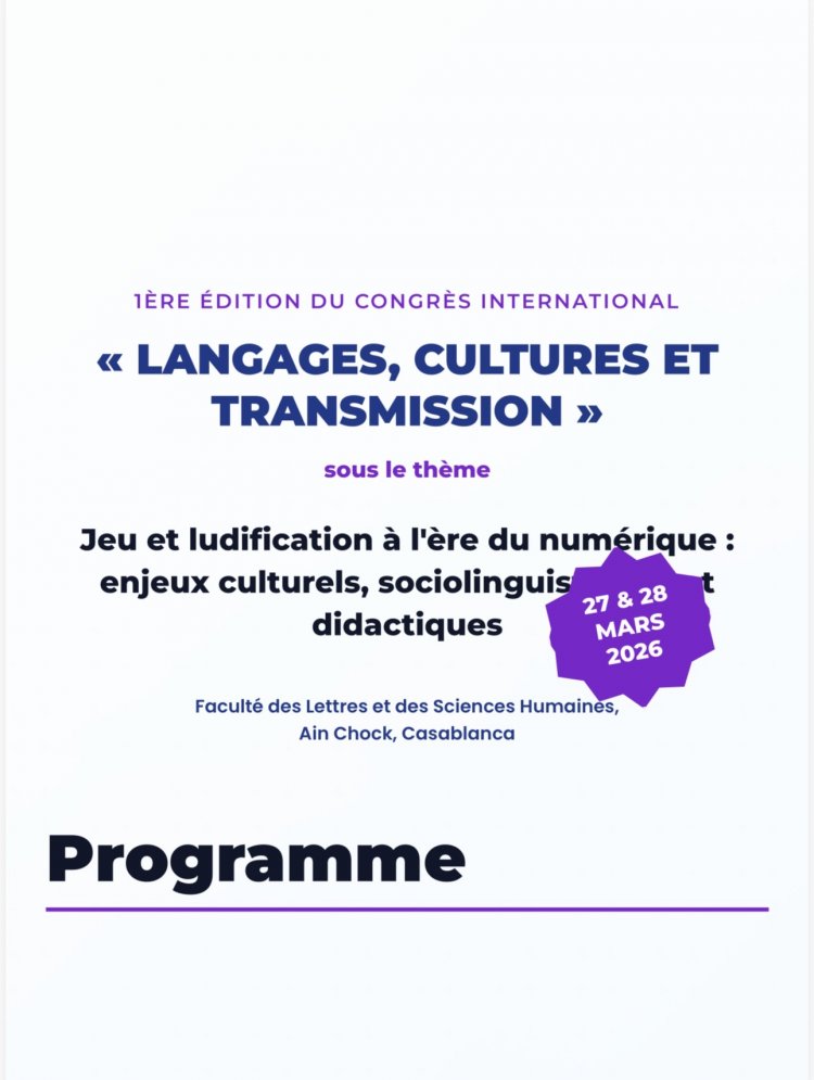 Au cœur de la Faculté des Lettres et des Sciences Humaines Aïn Chock de Casablanca, les 27 et 28 mars 2026, se tiendra la première édition du Congrès international « Langages, Cultures et Transmission », une initiative conjointe qui illustre avec éclat la vitalité de la coopération académique entre institutions marocaines et européennes. Porté notamment par les laboratoires LADSIS, relevant de l’Université Hassan II de Casablanca, le laboratoire CREDIF, affilié à l’Université Sidi Mohamed Ben Abdellah de Fès et le PLIDAM de l'INALCO-France, cet événement s’annonce d’emblée comme un espace de dialogue scientifique où se croiseront regards, disciplines et horizons culturels, comme en témoigne le programme officiel du colloque .