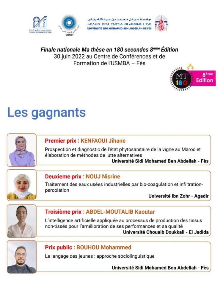 Le deuxième prix est revenu à Nisrine NOUJ, de l'Université Ibn Zohr d'Agadir, pour son sujet de thèse: " traitement des eaux usées industrielles par bio- coagulation et infiltration- percolation; quant au troisième prix, c'est Kaoutar ABDEL-MOUTALIB, de l'Université Ibn Zohr qui l'a remporté pour sa thèse: " L'intelligence artificielle appliquée au processus de production des tissus non-tissés pour l'amélioration de ses performances et sa qualité; le prix du public est revenu au doctorant de la Faculté des lettres et sciences humaines Dhar El Mehraz, de l'USMBA de Fès, Mohammed BOUHOU, pour sa thèse intitulée: " Le langage des jeunes: approche sociolinguistique".