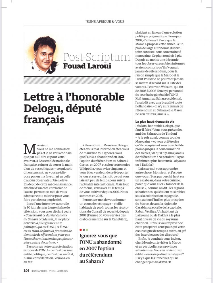 Dans l’arène des joutes diplomatiques, rares sont les interventions qui conjuguent avec brio la précision historique, la verve littéraire et le sens de la repartie. Parue dans Jeune Afrique (n° 3151, août 2025), la lettre de l’écrivain et universitaire marocain Fouad LAROUI à l’adresse du député français DELOGU s’impose comme une réponse cinglante, mais élégamment formulée, à une déclaration jugée maladroite, sinon ignorante, de la part de ce jeune parlementaire sur la question du Sahara marocain.