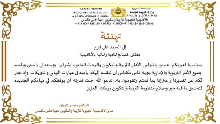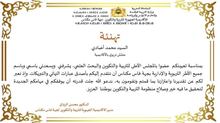 وأكد الدكتور محسن الزواق في هاته التهنئة على أنه: " بمناسبة تعيينكم عضوا بالمجلس الأعلى للتربية والتكوين والبحث العلمي، يشرفني باسمي وباسم جميع الأطر التربوية والإدارية بجهة فاس مكناس أن أتقدم إليكم بأصدق عبارات التهاني والتبريكات. وإذ نعبر لكم عن تقديرنا واعتزازنا بما قمتم وتقومون به، يضيف مدير الأكاديمية، ندعو الله جلت قدرته أن يوفقكم في مهامكم الجديدة لتحقيق مافيه خير وصلاح منظومة التربية والتكوين".