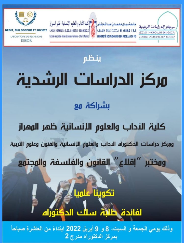 بشراكة مع كلية الآداب والعلوم الإنسانية ظهر المهراز، ومركز الدكتوراه في الآداب والعلوم الإنسانية والفنون وعلوم التربية ومختبر إقلاع في القانون والفلسفة المجتمع، نظم مركز الدراسات الرشدية، يومي 8 و9 أبريل 2022، بمركز دراسات الدكتوراه التابع لجامعة سيدي محمد بن عبد الله بفاس، ندوة تكوينية لفائدة الطلبة الباحثين بسلك الدكتوراه.