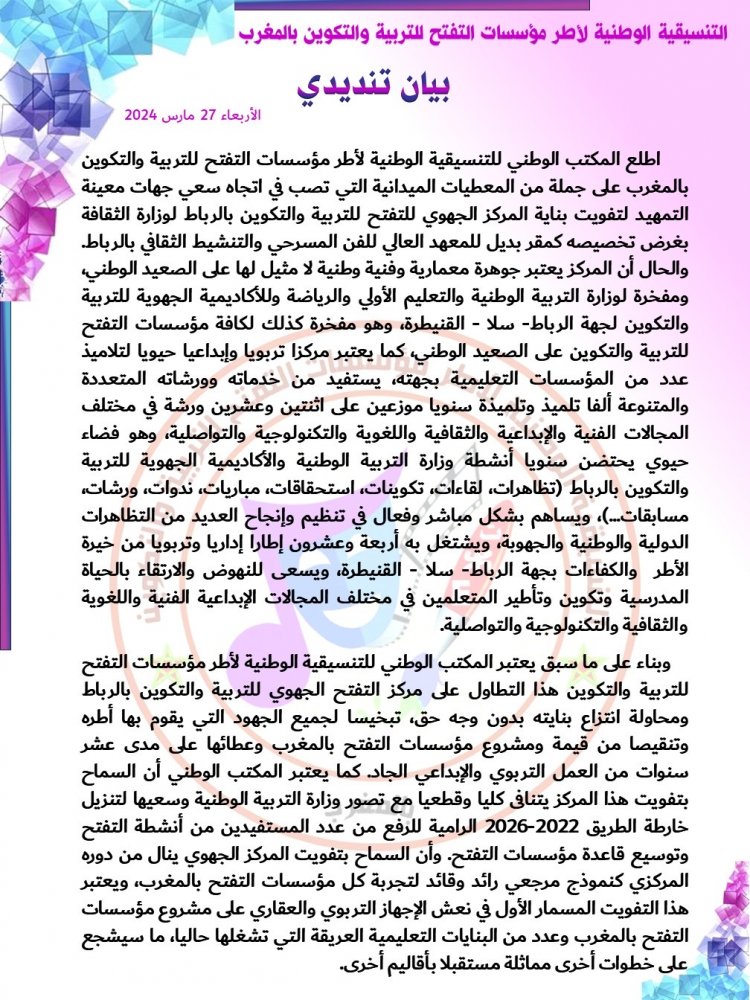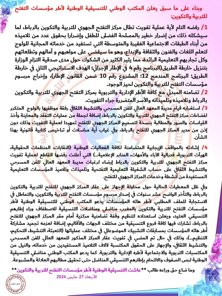 واستنادا إلىً ذات البيان، يعلن المكتب الوطني للتنسيقية الوطنية لأطر مؤسسات التفتح للتربية والتكوين: