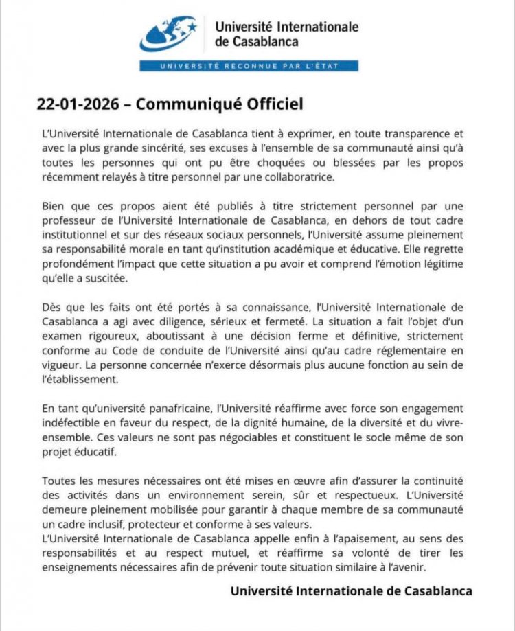 Après la diffusion sur les réseaux sociaux de propos tenus à titre personnel par une enseignante, l’Université Internationale de Casablanca a réagi avec célérité et fermeté. Dans un communiqué officiel publié le 22 janvier 2026, l’institution a présenté ses excuses, pris une décision définitive et réaffirmé son attachement aux valeurs fondatrices de l’enseignement supérieur marocain : respect, dignité et vivre-ensemble.
