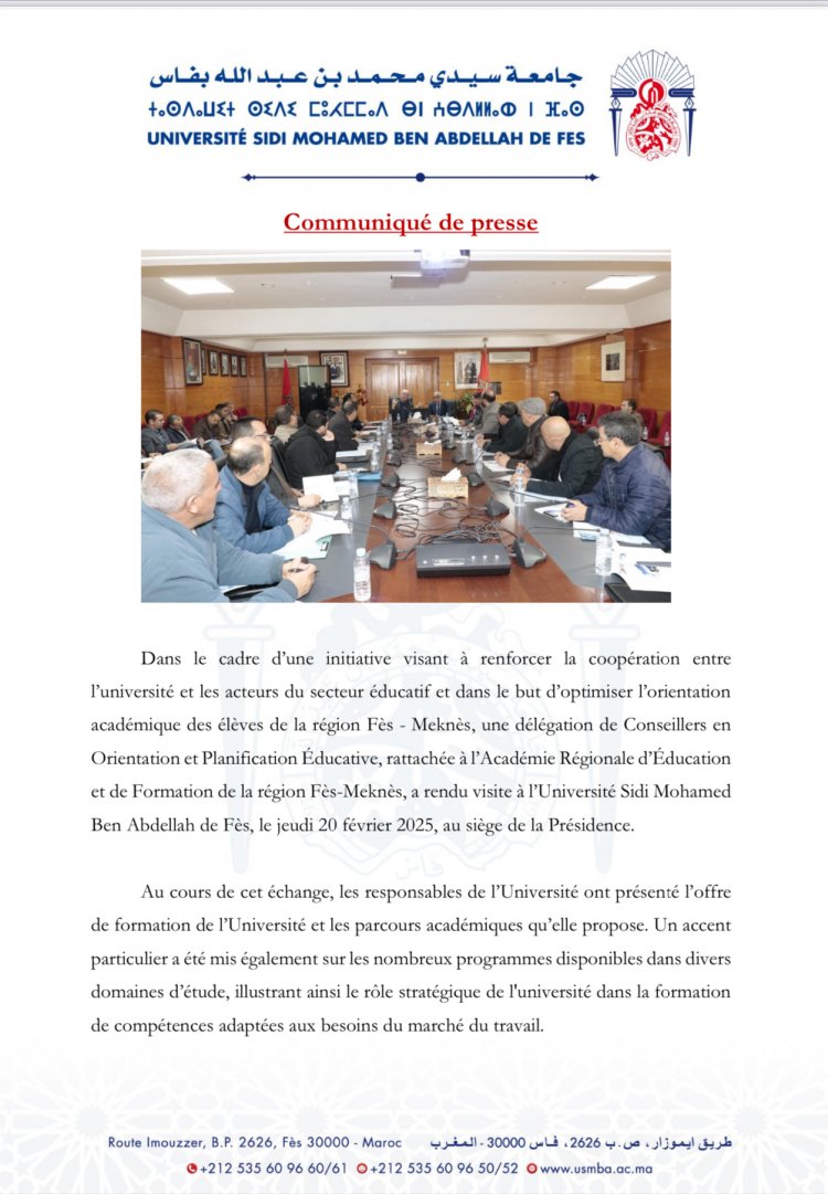 Dans un élan de collaboration prometteur, l’Université Sidi Mohamed Ben Abdellah (USMBA) de Fès a ouvert ses portes, le jeudi 20 février 2025, à une délégation de Conseillers en Orientation et Planification Éducative, issus de l’Académie Régionale d’Éducation et de Formation de la région Fès-Meknès. Cette visite, empreinte de dialogue et de partage, s’inscrit dans une démarche ambitieuse visant à renforcer les liens entre le monde académique et les acteurs du secteur éducatif, tout en optimisant l’orientation des élèves de la région.